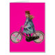 赤い帽子および青い服を身に着けているヴィンテージの自転車の女の子。それはネオンピンクの基盤に対して来ます。 すばらしい詳細との旧式で写実的なイメージ。 妖精グラフィックの礼儀。あなたの文字とのそれをカスタマイズことができます-背景色を変えることができます。