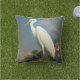 白いエグレ素晴らしトの美しい装飾用クッションは自然を最高のその特徴として、彼は灰色の背景を持つピンクのハイビスカスブッシュのベッドの上に止まっている。この一種のオリジナルは、フロリダ州ブラデントンのジャクリーン・スレターによって作られた。