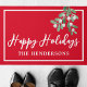このハッピーホリデーを持つ家族と友人を歓迎。赤い背景に水飾色のヤドリギが付いている。簡単にカスタマイズ可能デザインツールを使用して、文字のサイズ、スタイル、色を変更する。アートワークを作成すると、他のデザイナーの正確な画像が見つからない。オリジナル水彩©ミケーレ・デイヴィス。