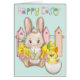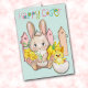 水仙の花を持つ愛らしいベビーのウサギが登場する、かわいいイースターシーズンのグリーティングカード。バニーは柵や水仙の群れの前に座っている。彼の隣には、孵化したばかりの小さな黄色い雛がいる。上部の様式化されたカラフル文字は「ハッピーイースター」と言う。カードの内側には、あなたのために2つの追加文字フィールドがカスタマイズある。