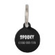 大きな目と幸せな顔表現を持つ可愛い幽霊キャラクターのデステイの漫画イラストレーション。背景色は黒。もう一方の側には、ペットの名前に理想的なパーソナル文字エリアと、所有者の電話番号に使用できるパーソナル化可能なエリアが2つある。