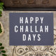 今季の入り口に楽しい休日のユーモアを加えなさい。デザインは白いブロックのタイポグラフィでスモーキーな青い背景モダンに「ハッピーChalah日」を特徴としている。