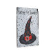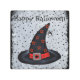 この金属製の壁のプリントはフェイク絵を描、オレンジ色の星とサッシュと銀のバックルを持つ黒い魔女の帽子と黒の上に白い外観である。帽子の先からぶら下がったかわいい黒いクモがいる。カスタマイズハッピーハローウィン文字とテンプレート。