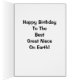黒い背景で撮影されたカラフルアンティークの地球の写真は、私の「地球の姪に対する最高のハッピーバースデー素晴らし!」のテーマである。 誕生日カード。地球の顔上の文字「最高のNiece On Earth素晴らし」がカードを完成させる。