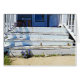 誕生日カード風化された木製の階段と紫色の花を持つ。