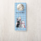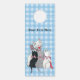 白と黒とグレーの3匹の可愛い子猫がピンクの弓を着て座っている白と白の幸せな母猫のライトブルーと白の格子柄の紙ドアハンガー。前カスタマイズと後ろのテキストとテンプレート。