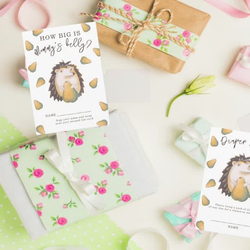 男女兼用ベビーシャワー招待状。水色のハリネズミと梨の足と多くの黄色の梨のイラストレーション。一致する項目が使用可能。
