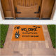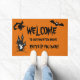 ハロウィン幽霊のよく出るハウスのドアマット、言う"私たちの家に歓迎幽霊のよく出るし、あえて入もしる。 家飾と幽霊のよく出るこうもりと幽霊と飛んでいるオレンジ色の魔女と!このドアマットはハローウィンパーティへの出入り口に最適!