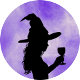 ハロウィンをテーマにした独身最後の夜会のためのカスタム魔女ラベル付きリキュール瓶。煙のような背景に魔女のシルエットが特徴です。