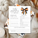 祝魅力的ハロウィーン弓テーマの赤ちゃんシャワーの予測とアドバイスシートと小さな人の到着!ハロウィーンをテーマにした赤ちゃんシャワーのトーンを設定するのに最適な方法で、きれいな白い背景にオレンジと黒のコケットの弓が楽しめる。