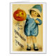 ヴィンテージハロウィーンのグリーティングカードのイラストレーションは、ジャックのランタンを持つ子供を示す。
