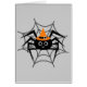 くもの巣Tシャツ、ボディスーツ、カード、ステッカー、トートバッグ、マグネット、その他のハロウィンデザインのアパレルとギフトアイテムでハロウィンスパイダーにオレンジ色のハロウィンウィッチハットを着た可愛い黒いクモ。