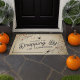 この可愛くて賢いハロウィーンフォーマットであなたのドアのステップに不気味な魅力を追加。デザインは、ヴィンテージレタリングの中央に感謝していは、不気味なクモと「落ち込みのため」を持つ血を飛ばしたクモの巣を備えている。家族の名前でパーソナライズ。