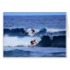 サーファーはハワイの大きな島の海岸から波に乗る。カードの裏には、女性サーファーがボードをビーチに乗る。