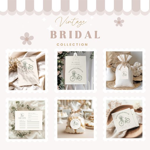 お嫁祝さまは、ヴィンテージの自転車が山の花のバスケットを備え魅力的、この手摘みフローラブライダルシャワーのデザイン運と一緒に。柔らかいセージの緑とアイボリーのパレットはロマンチックな国の側面を呼び出し感じ、それが農家市場や庭のイベントに最適なインスパイア。思い出に残る収集のためのイベント詳細スタイリッシュでパーソナライズ。