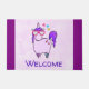 紫色のマネと尾をお洒落持つクールピンクとファンキーピンクのキュービユニコーンのスケッチを持つ歓迎の形式。この可愛い生き物はハート型のサングラスを着飾て、小さな星を持つ。ピンクの水色の背景ストライプと右に沿ってマゼン離れタの色を縁ど付ける。