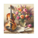 壁に寄り掛かるバイオリンや楽譜、花のガラスの花瓶などを描いた水彩画。