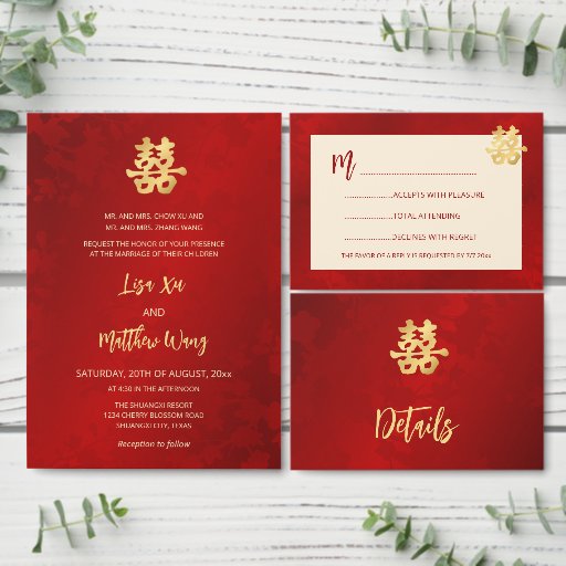 この中国のエレガント結婚式招待状は写真を備え実在、金ゴールドホイルの円形金ゴールドの二重の幸福のシンボルはフローラの赤い輝く背景の上に。手書きの台本の中の新婦エレガントと新郎の名前。裏に伝統的文字を中国の置いて。中国の結婚式招待状または茶道招き。