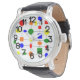 このメンズウォッチには、赤、黄、オレンジ、緑、青のグリッドのバウハウスデザインが描かれている。