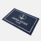 ネイビーの青い背景に白い航海のタイポグラフィを使用したモダンいかり休暇レンタルののマットのラグを歓迎する。この形式に休暇レンタル名前をカスタムするを追加エレガントし、ビーチコテージ、レイクハウスレンタルまたはairbnbに最適。