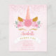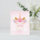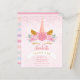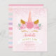 キュートなユニコーンのホーモダンン、赤面ピンクのフローラとカールした笑顔のまつ毛でデザインされた最初の誕生日の招待ガーリーと、上部の中心に繊細なバラ金ゴールドグリッターの散策と誕生日の女の子の名前のシックな書道レタリング。招待状の背面にはパステルカラーのレインボーストライプルが。