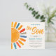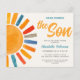 招待状の家族と友人の太陽をテーマにした赤ちゃんシャワーこの可愛い太陽の太陽の少年の赤ちゃんシャワー予算の招待と。ソフトクリームの背景に来カラフル水の色の太陽とスタイリッシュタイポグラフィの文字「ここザ・ソン」を特徴としている。簡単にカスタマイズ可能オリジナル水彩©ミケーレ・デイヴィス。