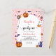 デザインは可愛い小さな幽霊、カボチャ、クモの巣、猫とハロウィーンのキャディーと猫のパステルピンクのアーチ背景。おもしろいスよくはしゃぐクリプト文字「不気味な1」