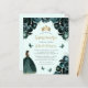 緑の背景にエメラルドの縁ど緑の水の色の花が咲き淡い色のあがる。金ゴールドティアラ、エメラルドの緑の王女のドレスと小さな緑の蝶の中の暗い髪の女の子は飾文字。金ゴールド色の手書きスクリプトには「キンセアニラ」と名誉のゲストの名前が表示さエレガントれ、残りの文字は灰色のサンセリフフォントで表示される。