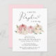 柔らかい灰色のタイポグラフィでフレンドリー、「甘い小さなカボチャが彼女の道にある」を特徴とする予算の赤ん坊の女の子のシャワー招待とハートのスワップとピンクとクリームのカボチャとフローラのブケットの水色のスクリプト。