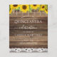 バジェットキンセアニェラお祝い素朴ファームハウスサンフラワーとストリングライトレース招待状木材の背景 – 特別な15誕生祝いのためのカントリーエレガントファームハウススパークルと美しくスクリプトのタイポグラフィを含む。