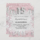 女のモダン子のスタイリッシュクインチェニェラ、15th誕生日パーティーのための魅力的で魅力的な招待。ピンクフェイクと銀の飾グリッターの塵と銀フェイク色の背景。名前とパーティー・詳細のパーソナライズおよび追加15番はバ書ロンスタイルフォント、スクリプト。