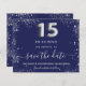 トレンディークインチェニェラ15th誕生日パーティーの日付を保存する。紺色の背景飾に銀色のフェイクグリッター粉。日付と名前/年齢をカスタマイズして追加する。文字:日付の保存は大きな書トレンディーの手入力スタイルスクリプトで行う。15号銀バルーンスタイルフォント。
