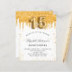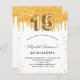 キンセエレガントーニェラ、15th誕生日パーティーのために。シックな白い背景。フェイク飾金ゴールドグリッタードリップ絵を描と見て。名前、年齢、およびパーティー詳細をカスタマイズして追加する。名前は手書入力のスタイルスクリプトで指定する。15番バルーン付きスタイルフォント