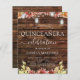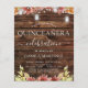 バジェット素朴カントリーアウトドアのダークウッドとバーガンディ、オレンジ、黄色のヒマワリとメイソンジャースとストリングライトの秋または秋キンセアニェラお祝いパーティの招待状 – 特別な誕生祝いのための美しくスクリプトのタイポグラフィを含むエレガント。