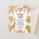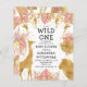 この「ワイルドワン」ジャングルサファリをテーマにしたコーディネートは、金ゴールドフォイルフェイク動物(キリン、ライオン、サル)、金ゴールド、ピンクのジャングルの葉、白い背景に金ゴールド紙吹雪の散在を特徴としている。黒い文字のママとシャワー詳細の名前を追加。反対側にはピンクと金ゴールドの葉調整フレームパターンが現れる。