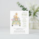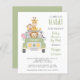 サファリの乗り物に積み上げられたベビー動物園の動物(ライオン、ゾウ、ゼブラ、サル、キリン)のイラストレーションやおもしろいタイポグラフィの「ワイルドになるフレンドリーよ」、陸軍の緑の台本を調整する「ベビーシャワー」の母名を掲載したメール招待状による可愛いバジェットシャワー。メール詳細でシャワーを簡単にパーソナライズしたり、車の「It's a Boy!」文字を変更したり、ライセンスプレートに期限を追加したりすること離れです空白の。