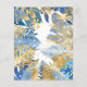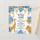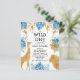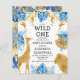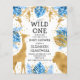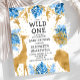 この「ワイルドワン」ジャングルサファリをテーマにした男の子の赤ちゃんシャワーの招待フェイクは、金ゴールドフォイルの動物(キリン、ライオン、サル)、金ゴールドと青いジャングルの葉、白い背景に金ゴールド紙吹雪の散策を含む。黒い文字のママとシャワー詳細の名前を追加。反対側に青と金ゴールドの調整葉フレームパターンが表示される。