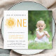 招待状の家族と友人の女の子の最初の誕生日パーティーこの可愛い予算の最初の誕生日招待状。黄色い水飾色の笑顔の太陽と言う"私たちの小さな太陽の光は1つ。写真や詳細で簡単にカスタマイズ。オリジナル水彩©ミケーレ・デイヴィス。