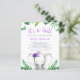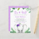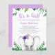 可愛い紫色のジャングル象の予算の女の子の赤ちゃんシャワー招待デザイン。この安価な招待状デザインは、水色のトロピカル葉とベビーゾウイラストレーションを備えている。