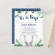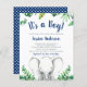 かわいいネイビーブルージャングル象の予算ボーイシャワー招待デザイン。この安価な招待状デザインは、水色のトロピカル葉とベビーゾウイラストレーションを備えている。