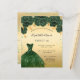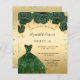 甘モダンい16スタイリッシュ、16歳の誕生日パーティーへの魅力的な招待。緑のフェイクグリッターダスト、エメラルドフェイクの緑のドレスと緑のバラ、花模様と金ゴールドの背景。名前は手書文字のスタイルスモダンクリプト付き。カスタマイズしてパーティー詳細を追加する。