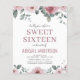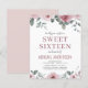 予算この埃っぽいバラ赤面ピンクMauveと白とフローラの水の色のSweet sixteenの誕生日パーティーの招待をメッセージと詳細と白い背景でパーソナライズすスタイリッシュる。バラスタイリッシュの花とユモダンーカリの植物の緑を含むこの招待はキュートとスクリプトのタイポグラフィエレガントは甘い16、誕生祝いに最適である。