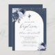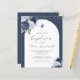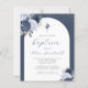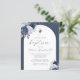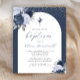 このバプテスマの招待エレガントは、紺色の背景に白いアーチの形を備え、銀の葉を持つダスティブルーとネイビーブルーのフローラの花束のペアによって二つのコーナーに輝く。三つ目の小さな花束は銀の箔のクロスに現れフェイク、"私たちの息子のバプテスマのために私たちに参加してください"の単語の上に海軍の青色の手書き書や木炭の灰色のイタリックエレガントの。青いスクリプトで名前を付け、グレーのsans serifフォントで詳細をカスタマイズ。銀の箔の紙吹雪フェイクを振り掛け飾て、カードの上端に。裏面はネイビー無地のブルー。
