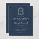 このクラシックエレガント、卒業記念パーティーの招待デザインは、ネイビーの青い背景にラインアートのアカントスの紋章で囲まれたオープンセリフフォントの白いモノグラムイニシャルを特徴とする。大学院の名前と文字詳細でパーティーをパーソナライズ。カードの裏はネイビー無地のブルー。高校、大学、大学の卒業生に最適。