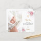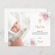 洗礼モダンサンキューカードエレガント。ピンクと白の飾花模様、花とシックな白い背景。パーソナライズし、赤ちゃんの女の子の写真を追加、ありがとうメモと名前。