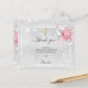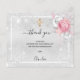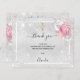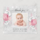写真シンプル付きエレガントサンキューカードと写真。銀の金フェイク属の外観の背景、白いフレーム、フェイクグリッターの塵、ピンクのバラ、花模様。黄金の十字架。お礼のノート、赤ちゃんの女の子の写真と名前をカスタマイズして追加。ブラック文字。