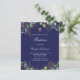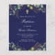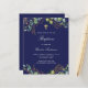 ユーカリの緑と飾金のを持つ海軍の青い背葉景。パーソナライズし、子供の名前と式の詳細。背面:ネイビーブルー背景