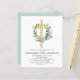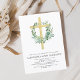 予算フローラセージ緑の少年または女の子のユーカリと金ゴールド木製クロスとリース植物緑の水色クリスチャン宗教的バプテスマ招待状。