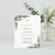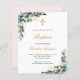 ユーカリの飾緑と金の葉と金のクロスとの白い背景。パーソナライズし、子供の名前と式の詳細。黒と金色の文字背面:赤面ピンクの背景色。