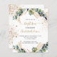 ユーカリ飾の緑と金の葉金ゴールドとフェイクグリッターの滴を持つ白い背景。パーソナライズし、子供の名前と式の詳細。黒と金色の文字背面:白い背景と金色のフェイクグリッター滴